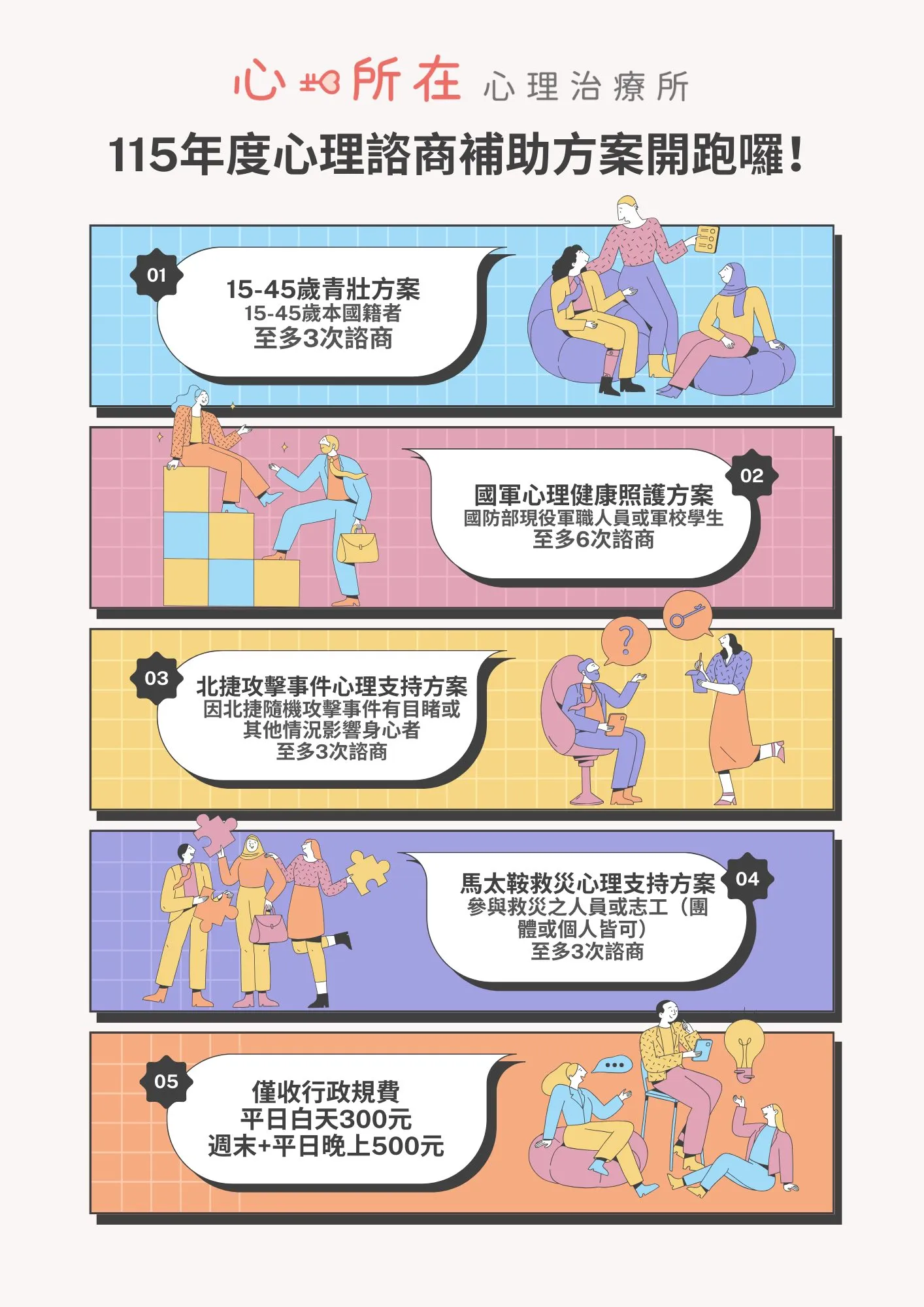 以下補助方案皆只需要付行政費,諮商費用是免費的!!!